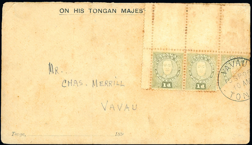 Tonga: Official Mail: 1911 (Nov. 16) envelope (229 x 102mm) with typed ''O.H.M.S.'' endorsement, addressed to Auckland, showing good Government Frank, Nukualofa despatch and showing scarce ''TOKONI MINISITA TAUHI PAAGA, TOGA'' cachet in violet initialled at lower left, some creasing. Ex Baxendale. The property of another vendor. Photo.