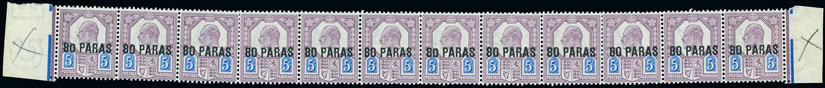 Trinidad and Tobago: 1918 (Feb.-May) ''War/Tax'' type 26 on 1/2d. bluish green a mint vertical strip of five, lower four stamps without overprint (on reverse due to paper folds), reinforced perfs., each has blue mark on gum, otherwise fine and rare. S.G. 187a, cat. £1,500+. Photo.