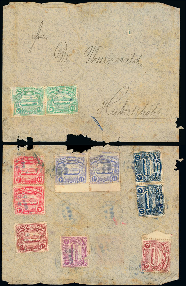 Tonga: Subjects: Registered Mail: 1898 to 1949, a selection of covers, incl. 1898 (Mar. 26) envelope, registered to U.S.A., franked by 1897 1/2d. to 10d. values, cancelled by ''NUKUALOFA'' c.d.s's, 1900 (Oct.) envelope to Germany, franked by 1897 2s., tied by lightly struck ''VAVAU'' c.d.s., with violet oval ''REGISTERED AT/VAVAU'', 1902 (Jan. 10) long envelope to Vavau, franked by 1897 2d., 4d. and 1s., tied by ''NUKUALOFA'' c.d.s's, 1913 (May 27) long envelope to London, franked by 1897 1/2d. (2) to 2s. all tied by ''VAVAU'' c.d.s's, 1917 (Aug. 24) envelope to Fiji, franked by 1897 1d. 2d., 71/2d., 2s. and 5s., cancelled by ''NUKUALOFA'' c.d.s's with small oval ''REGISTERED AT/NUKUALOFA, TONGA'', 1919 (Nov. 15) envelope to Australia, franked by 1897 2d., 21/2d., 6d., 71/2d. and 2s. tied by ''NUKUALOFA'' c.d.s's with small oval ''REGISTERED AT/NUKUALOFA, TONGA'', also original receipt for three items, etc. (28 items)