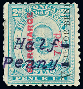 Tonga: Revenues: 1885 Consular Service 2s. red and black, cancelled by oval ''BRITISH CONSULATE/TONGA''. This is believed to be the only example of a British Consular revenue used in Tonga. Photo.