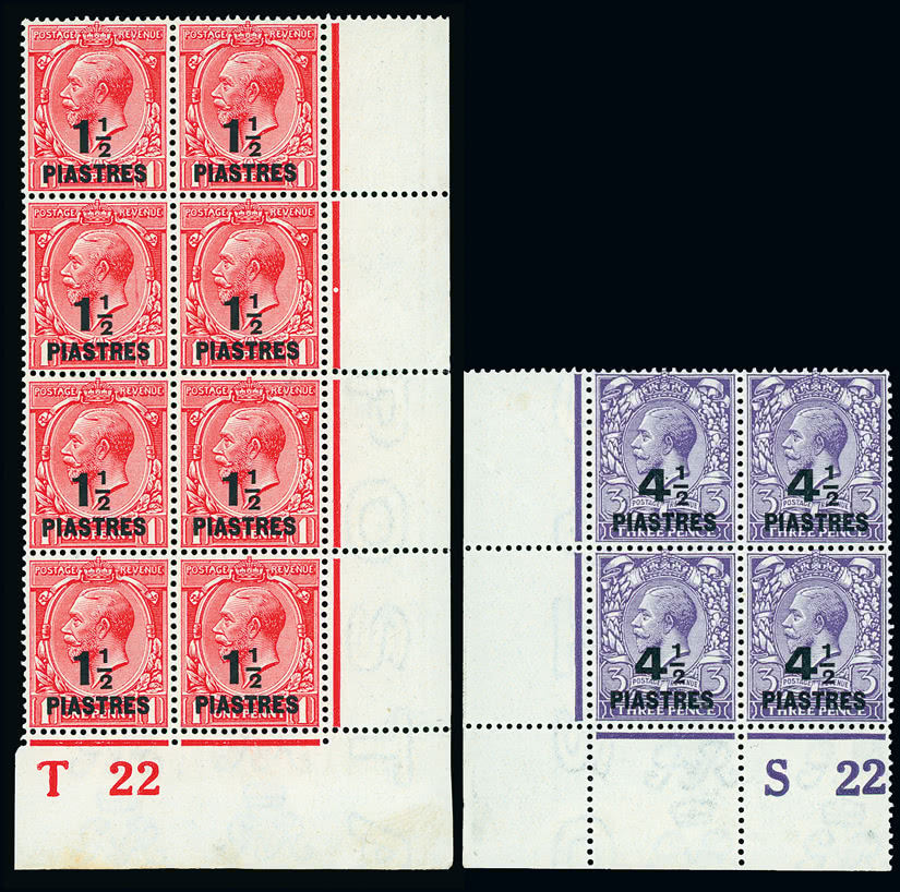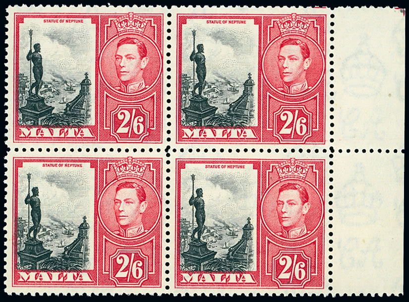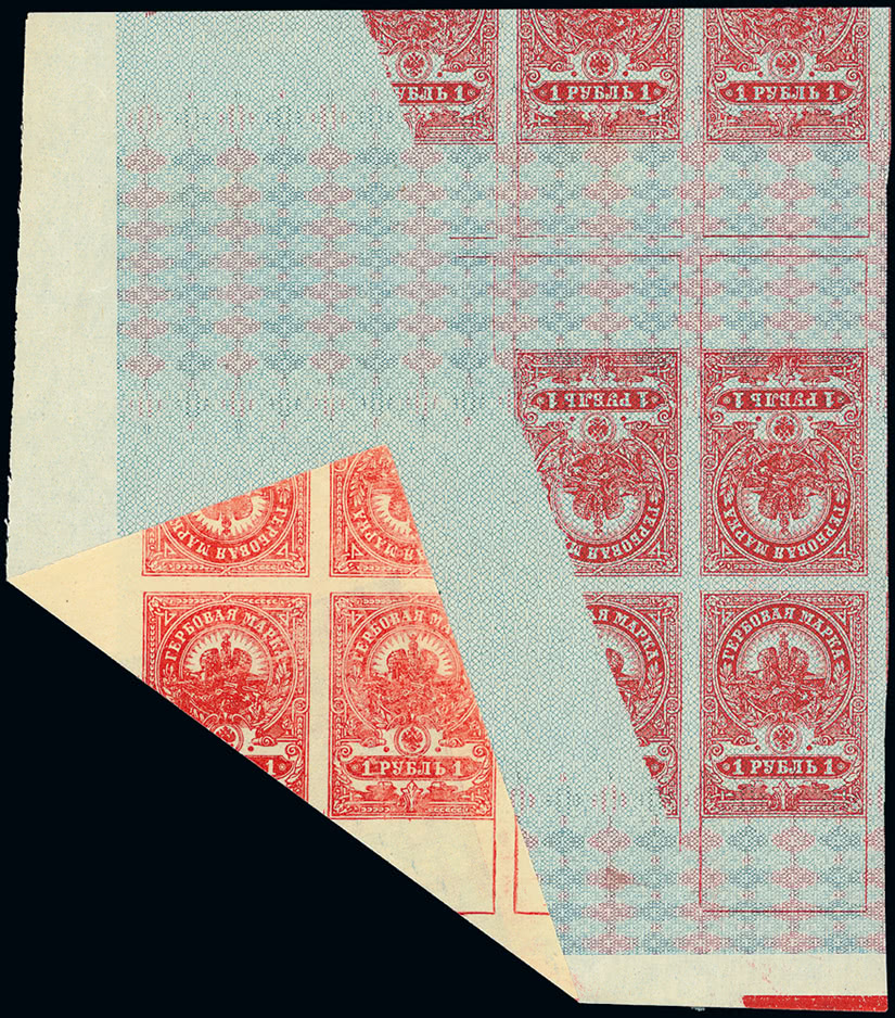 Trinidad and Tobago: 1918 (Feb.-May) ''War/Tax'' type 26 on 1/2d. bluish green an unmounted mint block (3 x 5) from the top right corner of the pane, all showing major misplacement of overprint, fine. S.G. 187 var. Photo.