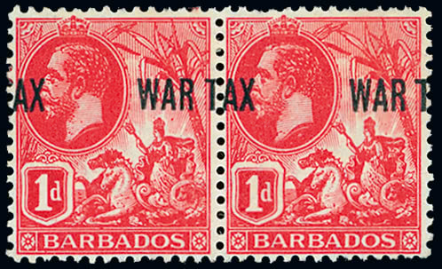 Trinidad and Tobago: 1918 (Feb.-May) ''War/Tax'' type 26 on 1d. scarlet in a mint pair from the left of the pane, both showing variety overprint double, fine mint. SG. 188a, cat. £320. Photo.
