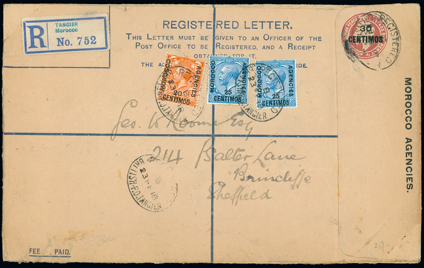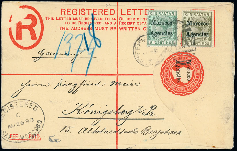 Tonga: Postal Stationery: A group of registered envelopes, comprising 1895 (July 11) 4d. envelope, 1893 (Apr.) size H2, addressed to Capt. Herrold near Auckland endorsed ''Per S S Oralau/& Monowai/via Samoa'' bearing 1895 (May) surcharge set of four values, some perf. toning, tied by ''NEIAFU/VAVAU'' c.d.s's, with lightly struck July 27 arrival backstamp (Ex Peach), 1898 (Nov. 23) 4d. envelope, 1893 (Apr.) size G, from Nukualofa to Switzerland addressed by Chief Postmaster William Campbell bearing 1897 Pictorial 1/2d., 2d. and 10d. (closed tear at foot) with New York registration label alongside, San Francisco, New York and Bern Jan. 1 1899 arrival backstamps, 1906 (Oct. 2) 4d. envelope, 1901 (Mar.) size G, used from Nukualofa to Auckland bearing 1897 Pictorial 6d. pair with registration oval at left, Oct. 10 arrival on reverse, 1938 (July 18) 3d. envelope size G in dark blue, scarce inter-island usage to Nukulaofa bearing 1d. just tied by Vavau c.d.s. with uncancelled 1/2d. below and registration label at left, and 1943 (Jan. 14) 3d. envelope size G in blue, used from Nukualofa to New South Wales bearing 1/2d. (2), 1d., 11/2d. and 2d., twice censored with octagonal and diamond marks, resealed with type L3.2 ''OPENED BY EXAMINER/WW/2'' and Australian labels, slightly mixed condition. H&G 7, 8, 9, 21, 21a. Ex Baxendale. The property of another vendor.