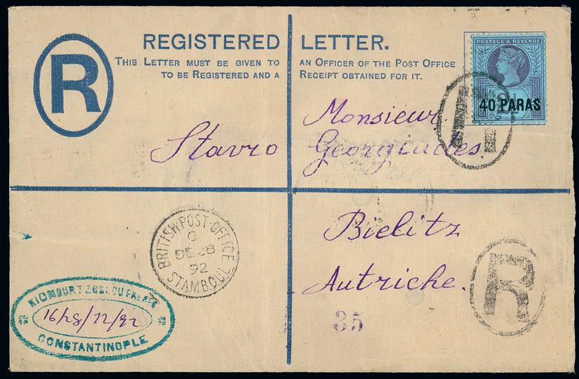 Tonga: Postal Stationery: Registered Envelopes: 1894 (Aug.15) 4d. envelope, 1893 (Apr.) size G, used to London bearing 1893 surcharged in black 21/2d. on 2d. green (2) tied by Nukulaofa c.d.s. with London transit of October 13 arrival alongside. Photo.
