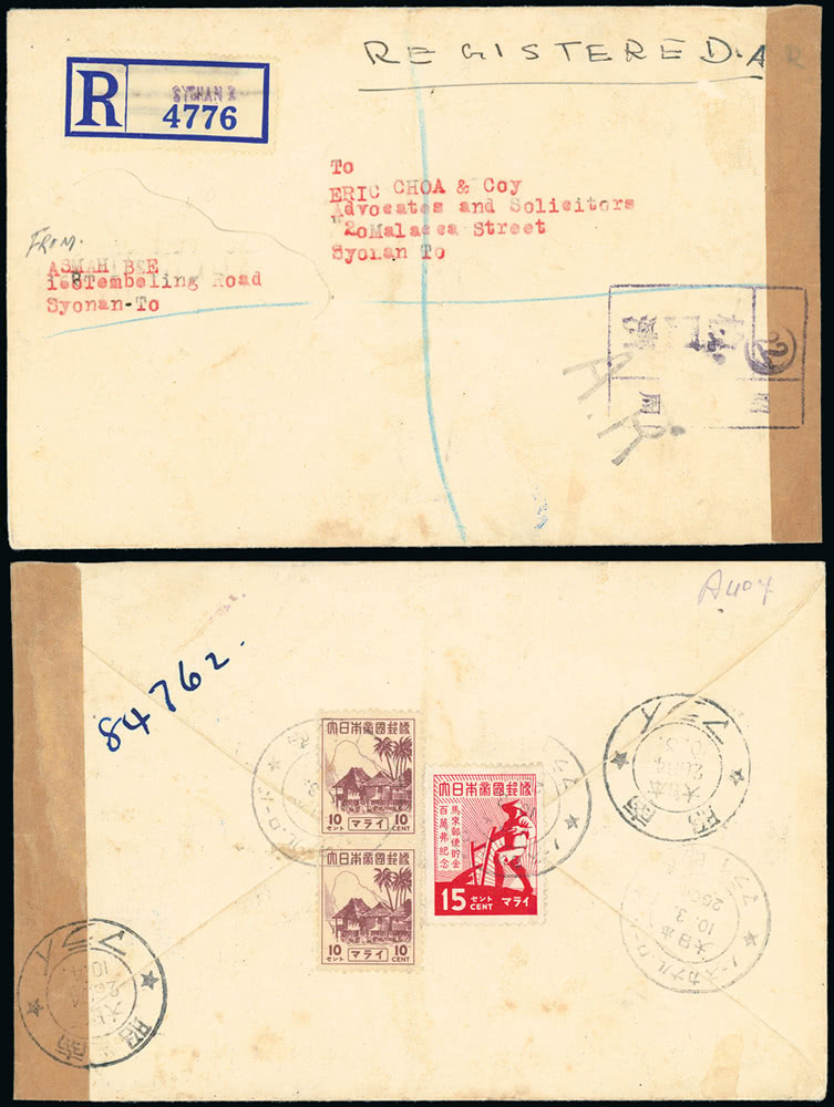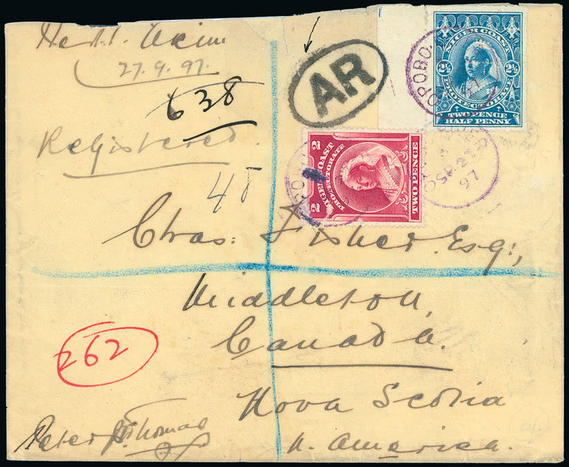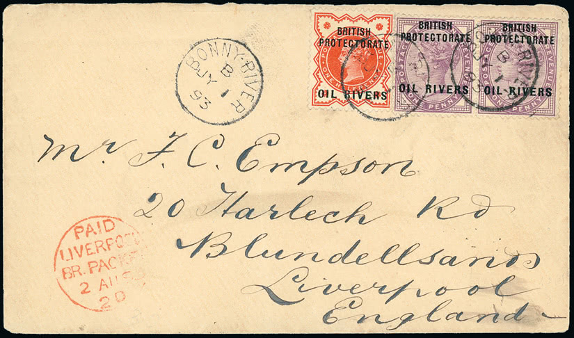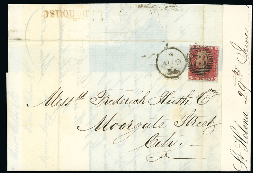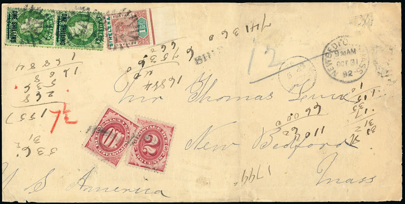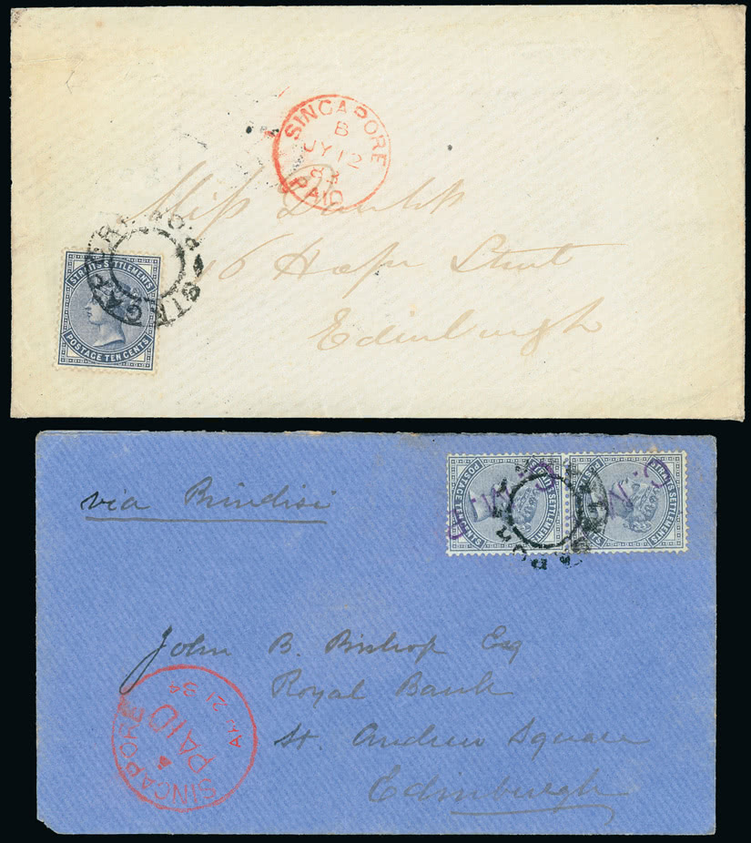 Trinidad: 1882 (Oct. 23) envelope to Essex bearing 1882 1d. on 6d. (red) strip of four, tied neat Trinidad c.d.s's, with London ship letter c.d.s. in red alongside and London transits on reverse, also 1884 (Jan. 9) local envelope with forged 1882 1d. on 6d. in black. Photo.