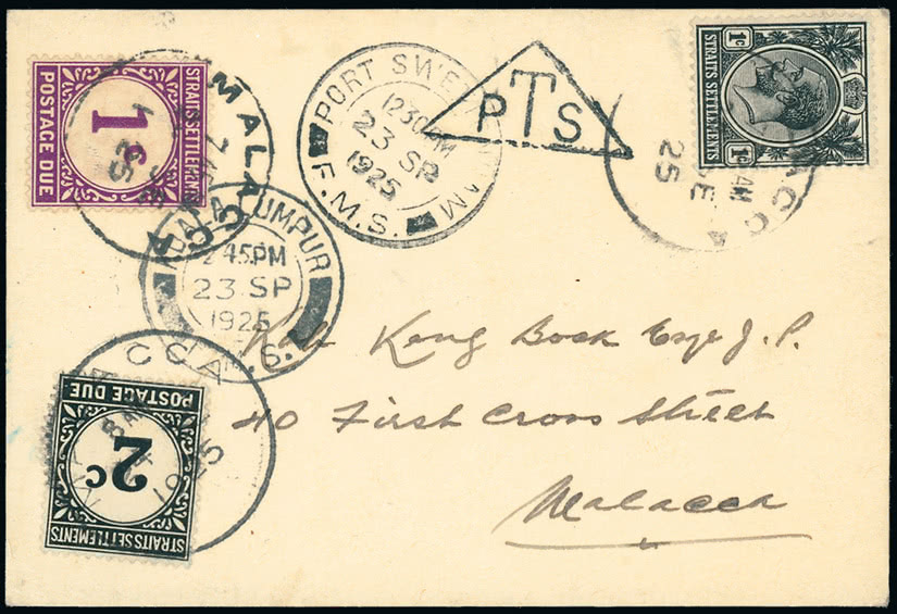 Tristan da Cunha: 1925 envelope (without flap), addressed to Rev. Rogers in London via Durban, bearing two good strikes of the type II cachet, with Durban July 25 datestamp, handstruck ''2d.'' and with G.B. 2d. postage due tied by London c.d.s. Carried on the S.S. Anvergoise which called at Tristan on July 12 1925. Photo.