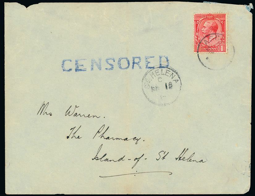 Tristan da Cunha: 1929 (ca.) envelope, addressed to Mrs. Rogers in Leicester, bearing G.B. 11/2d. tied by two type III cachets in purple (one more on reverse), with a fine strike of the very rare type IVa cachet in red. Photo.
