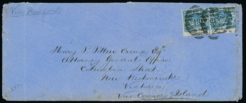 Mail to Overseas Destinations: Vancouver Island: 1867 (July 19) envelope from London to New Westminster, Vancouver Island, bearing 1867-80 watermark spray 2s. dull blue plate 1 HE-IE vertical wing margin pair, plus 1864 (Aug. 31) envelope to Victoria bearing 1862-64 1s. green plate 1 AE-AF wing margin pair, with additional 4d. tied at left, also 1889 (Dec. 3) envelope to ''Captain Robertson, 'S.S.Islander', Victoria B.C. (or Elsewhere)'', bearing 'Jubilee' 6d., all a trifle soiled with faults but an interesting trio. Photo.