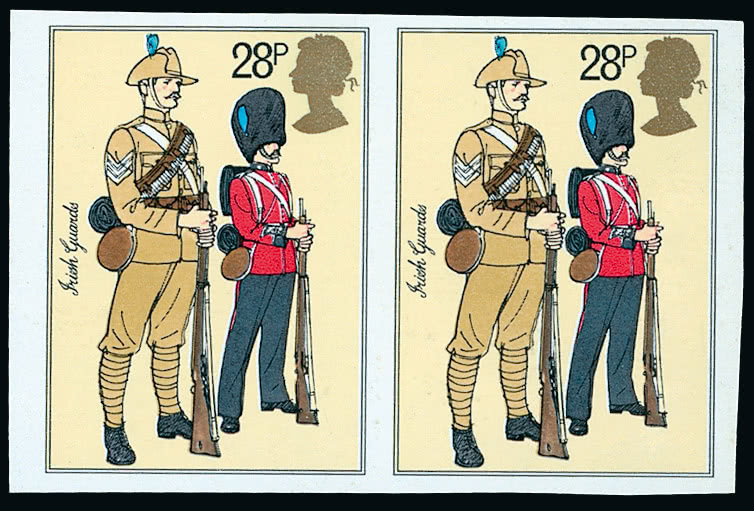 Queen Elizabeth II: 1983 British Army Uniforms 28p. imperforate horizontal pair, fine unused. S.G. 1221a, EC GBR2441a. Only two pairs (one used) recorded. Photo.