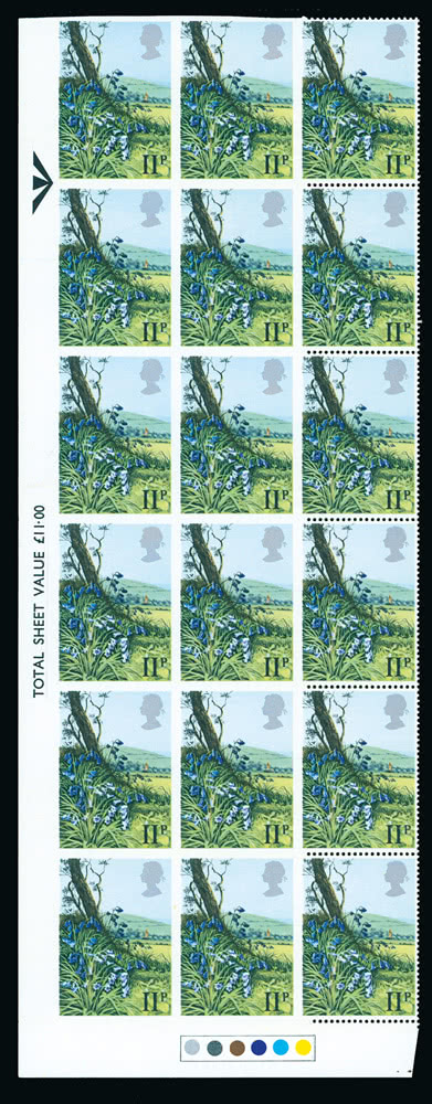 Queen Elizabeth II: 1979 Flowers 11p. lower left corner block of eighteen (3 x 6), the left row variety imperforate, unmounted mint, two horizontal creases affecting two rows of stamps, otherwise fine. Ex Baillie. S.G. 1081a, EC GBR2162a. Ten to fifteen pairs known. Photo.
