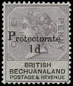 706 | Sale number: 17 Bechuanaland: Protectorate: 1888 ''Protectorate'' 1d. on 1d. lilac and black, variety small figure ''1'', mint, fine, normal for comparison. S.G. 41, a, cat. £408. Photo. Price Realised £210 |