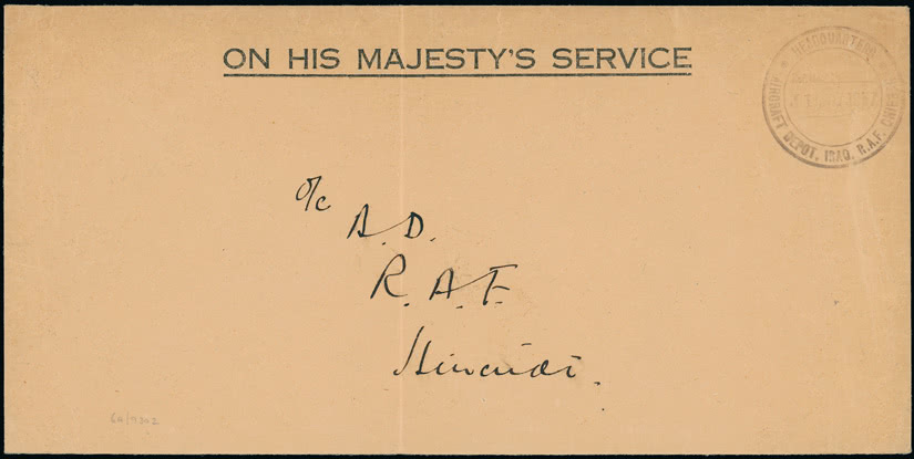 1164 | Sale number: 109 Iraq: 1937 (May 31) O.H.M.S. stampless first flight envelope from Hinaidi to R.A.F. Dhibban, with ''HEADQUARTERS/ AIRCRAFT DEPOT, IRAQ, R.A.F. DIBBAN'' circular cachet, Central Registry mark on reverse, filing fold, otherwise fine. Only 11 covers known. Photo. Price Realised UNSOLD |