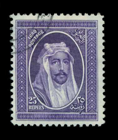 2274 | Sale number: 56 Iraq: 1931 King Faisal 25r. violet, fine used, scarce. S. G. 92, cat. £1,100. Photo. Price Realised £450 |
