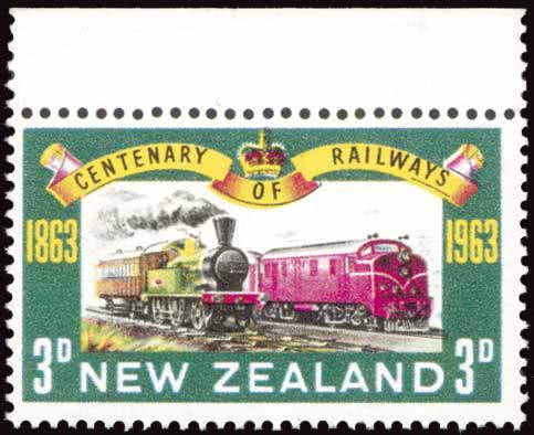 1188 | Sale number: 16 New Zealand: 1963 Railway Centenary 3d. variety blue (sky) omitted, also a block of four from the left showing dramatic perforation shift to lower right, normal single for comparison, mainly fine unmounted mint. S.G. 818a, 818 var. Photo. Price Realised UNSOLD |