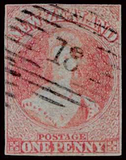 1037 | Sale number: 17 New Zealand: 1855-57 Blued paper 1d. red, good margins all round, lightly cancelled ''18'' in bars, fine. S.G. 4, cat. £1,600. Photo. Price Realised UNSOLD |
