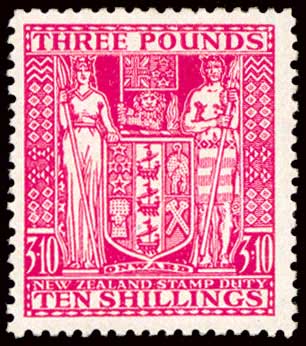 1046 | Sale number: 17 New Zealand: Postal Fiscals: 1940-58 £3.10s. rose, fine mint. S.G. F209, cat. £1,500. Photo. Price Realised £480 |