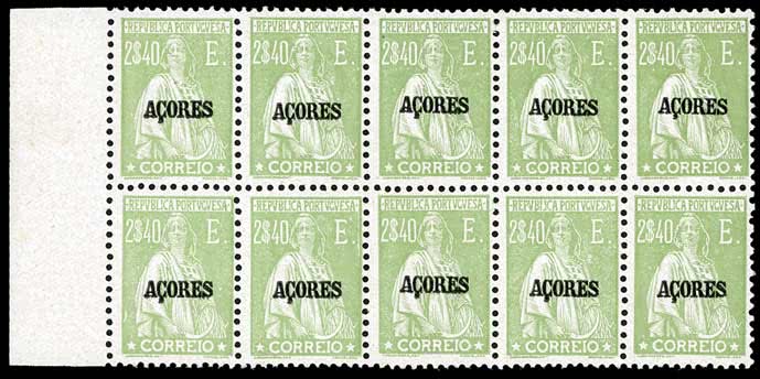 4672 | Sale number: 38 Portuguese Colonies: Azores: 1924-30 2E.40 sage-green, mint block of ten (5 x 2), marginal from the left of the sheet, unmounted except one, the largest known mint multiple. S.G. 319, cat. £550+. Price Realised £120 |
