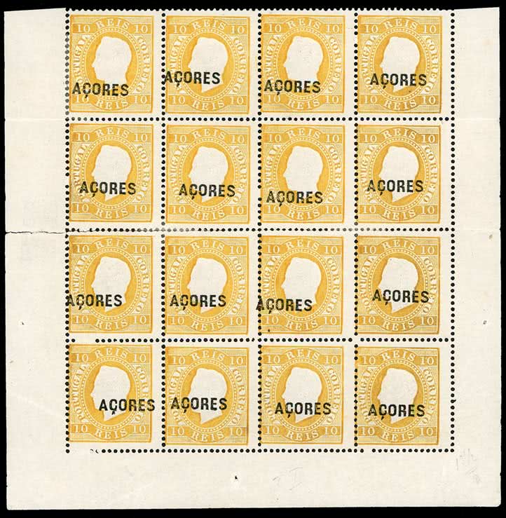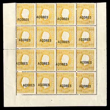 3511 | Sale number: 28 Portuguese Colonies: Azores: 1875-76 10r. yellow, perf. 131/2, mint block of sixteen, the lower four rows of the sheet with margins, some separation and reinforcement, otherwise mainly fine and the largest known mint multiple of this perforation. S.G. 39, cat. £592+. Price Realised UNSOLD |