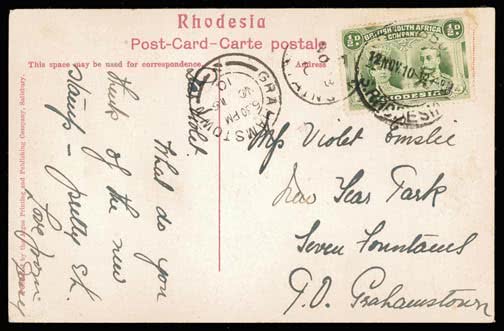 1086 | Sale number: 15 Rhodesia: 1910-13 Perf. 14 1/2d. yellow-green tied by Salisbury ''12 NOV 10'' c.d.s. to p.p.c. of Victoria memorial to Grahamstown, slight perf. stains but rare. Photo. Price Realised UNSOLD |