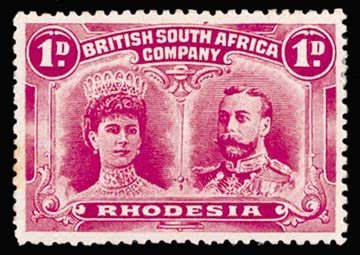 1139 | Sale number: 17 Rhodesia: 1910-13 Double Heads, Perf. 14 10d. carmine and deep purple fine mint. S.G. 150, cat. £600. Photo. Price Realised £200 |