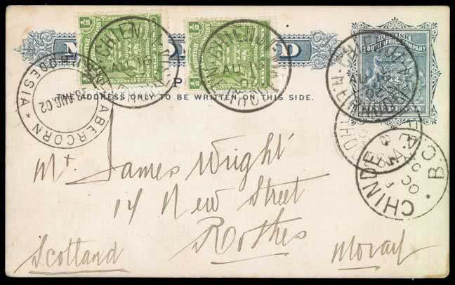 1308 | Sale number: 16 Rhodesia: Postal History and Covers: 1902 (Aug. 16) B.S.A. Co. Mashonaland 1d. postcard to Scotland, uprated with 1/2d. (2), cancelled good to fine ''CHIENJI/ N.E. RHODESIA'' single ring c.d.s.'s with ''2'' in year date inverted, Abercorn Aug. 28, Fife Sept. 8, Chinde Oct. 5 transit datestamps. Rare, this office previously believed closed between 1893 and 1907. Ex F.C. Donaldson. Photo. Price Realised UNSOLD |