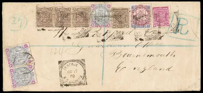 1309 | Sale number: 16 Rhodesia: Postal History and Covers: 1902 (Oct. 17) an exceptional British South Africa Co. envelope from the Stroud correspondence, registered to Bournemouth at 1/4 rate, bearing 1897 3d., 4d., 1898-1908 1d., 2d. strip of single cancelled Serenje squared circles and with ms. framed ''R'' and no. ''27'', further 1897 4d. pair added and cancelled Nov. 24 at Fife (this final assessment before allowing passage into B.C.A. being now five times the 4d. per 1/2oz rate), backstamped Fort Jameson Oct. 27, Chinde Jan. 6, London Feb. 15 and next day arrival. Photo. Price Realised UNSOLD |