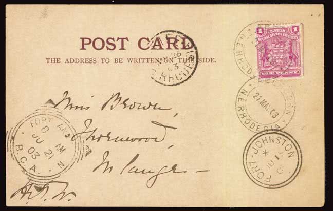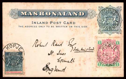 1111 | Sale number: 17 Rhodesia: Early Covers: 1899 (Oct. 19) Mashonaland 1d. Inland stationery card used with added 1893 1/2d. and 1896 1d. to Cornwall, cancelled Kopje c.d.s.'s., slight staining. Sent during the Matabele Rebellion by Dr. R.F. Rand, appointed by Rhodes as Senior Medical Officer to the B.S.A. Co. Police, with message commenting that ''This is going to run the gauntlet ... per wagon express.'' Photo. Price Realised UNSOLD |
