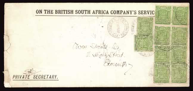 1312 | Sale number: 16 Rhodesia: Postal History and Covers: 1904 (Apr. 13) On The British South Africa Company's Service envelope ex Stroud Correspondence to Exmouth, Devon, franked 1/2d. block of four and six singles cancelled fair strikes of Fort Jameson c.d.s., backstamped Salisbury May 5 and May 29 arrival. Photo. Price Realised UNSOLD |