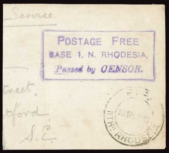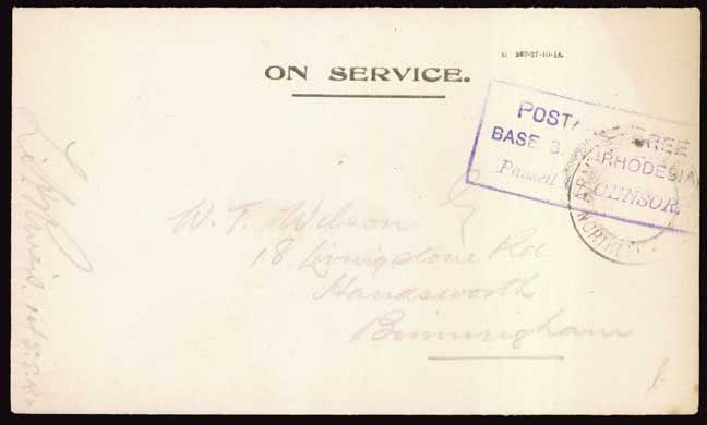 1317 | Sale number: 16 Rhodesia: Postal History and Covers: Northern Rhodesia Forces 1915-16: Base 6, a good strike of the cachet in violet on stampless ''ON SERVICE'' envelope (coded G 282-27-10-14) addressed to the dealer, W.T. Wilson in Birmingham, the cachet partially overstruck by indistinct A.P.O. c.d.s. and signed at left by Private Rivers of the S.R.V. Photo. Price Realised UNSOLD |