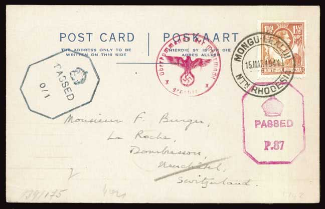 1318 | Sale number: 16 Rhodesia: Postal History and Covers: 1944 (Mar. 15) postcard to Switzerland from the Rev. Burger at Sefula, franked N. Rhodesia 11/2d. cancelled superb strike of scarce double ring Mongu-Lealui c.d.s., with two British military censors in red and black, German Oberkommando der Wehrmacht censor in red, attractive. Photo. Price Realised UNSOLD |