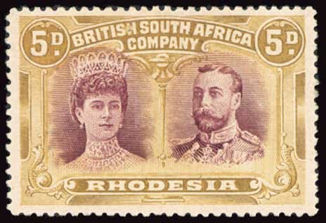 1135 | Sale number: 17 Rhodesia: 1910-13 Double Heads, 5d., a selection on leaves with mint (9, incl. purple-brown and ochre, another with "lines by King's Cheek' variety), and used (7, incl. purple-brown and ochre) showing a good range of shades, varied condition. Price Realised £180 |