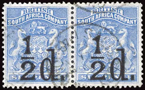 1084 | Sale number: 15 Rhodesia: 1896 1d. on 4/- part original gum, perf. faults, 3d. on 5/- large part original gum, fine. S.G. 52, 53, cat. £420. Price Realised £60 |