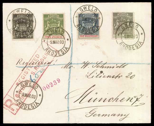 1310 | Sale number: 16 Rhodesia: Postal History and Covers: 1903 (Mar. 9) registered cover to Germany bearing 1892-93 1d., 1892-94 1/2d., 2d., 3d., tied by fine individual strikes of Gwelo c.d.s. with additional strike and large framed registration marking in red at left. S.G. 1, 19-21. Photo. Price Realised UNSOLD |