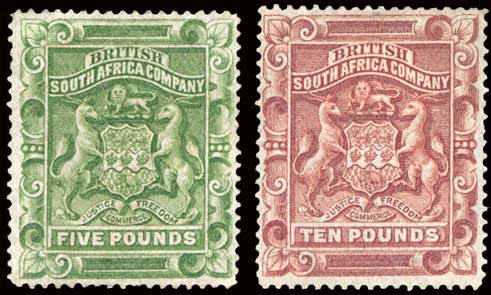 1119 | Sale number: 17 Rhodesia: 1892-93 £5 sage-green and and £10 brown, large part original gum, both with faults but good colours and appearance. S.G. 12, 13, cat. £4,350. Photo. Price Realised UNSOLD |