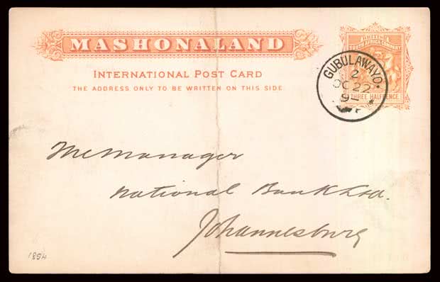 1106 | Sale number: 17 Rhodesia: Early Covers: 1894 (Oct. 22) Mashonaland 11/2d. International stationery card to Johannesburg, cancelled fine strike of scarce ''GUBULAWAYO/2/OC 22/9-'' c.d.s., backstamped red Oct. 20 double oval datestamp of The Standard Bank of South Africa Ltd., Bulawayo, Pretoria Oct. 28 transit and Oct. 29 arrival, vertical fold well clear of strike. Photo. Price Realised UNSOLD |