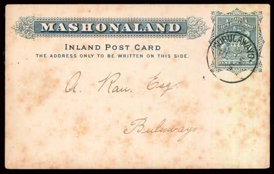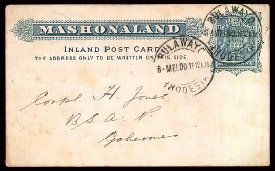 1115 | Sale number: 17 Rhodesia: Early Covers: 1900 (May 8) Mashonaland 1d. Inland stationery card with printed Bulawayo Chronicle subscription reminder, addressed to a Corporal in the B.S.A. Co. Police in Gaborones, cancelled Bulawayo ''8-MEI.00'' (''Taal'' slug). Ex. G. Simpson. Photo. Price Realised UNSOLD |
