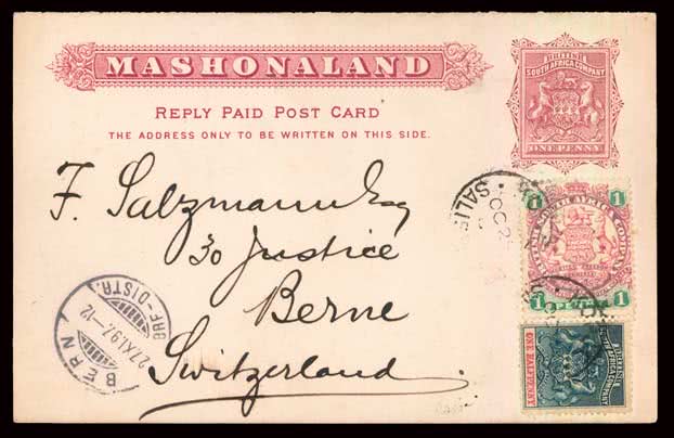 1112 | Sale number: 17 Rhodesia: Early Covers: 1897 (Oct. 29) Mashonaland 1d.+1d. stationery reply card used to Switzerland with added 1892 1/2d., 1896-97 1d., cancelled fair Kopje c.d.s.'s with Berne Nov. 27 arrival, the reply half unused. Photo. Price Realised UNSOLD |