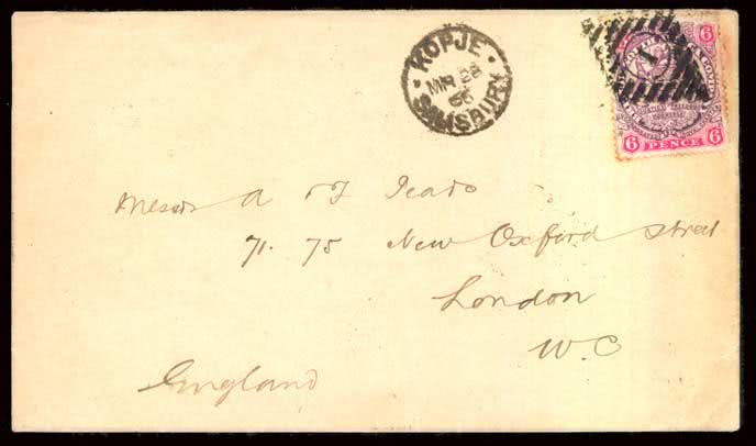 1113 | Sale number: 17 Rhodesia: Early Covers: 1899 (Mar. 28) envelope to London franked 1896-97 6d. die II, some toning around perfs., tied by ''I'' in diamond with Kopje c.d.s. (''99'' inverted) alongside, backstamped fine Salisbury double circle (with single asterisks at left and right - unrecorded by Knight) same day transit and Apr. 21 arrival. Photo. Price Realised UNSOLD |