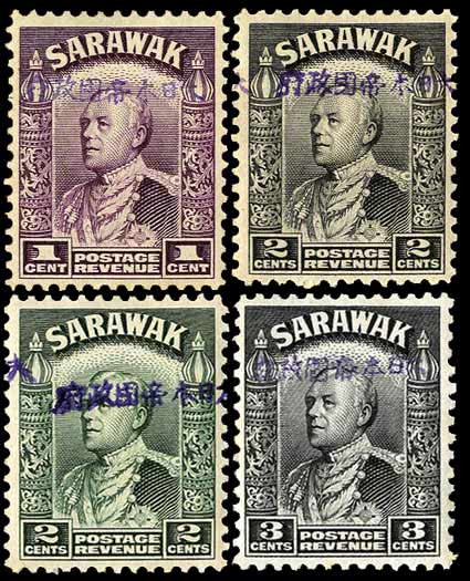 2024 | Sale number: 21 Sarawak: Japanese Occupation: 1942 1c., 2c. green (in black), 3c. green, 4c. (in black), 8c. carmine, 10c. (3, two overprinted in black), 25c., $1, $2 and $4, a few small faults incl. $2 with short perf., otherwise fine, cat. £1,257. Price Realised £240 |