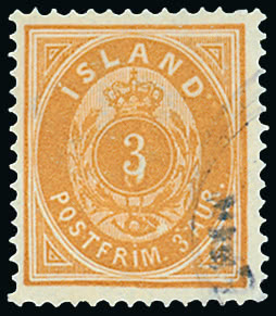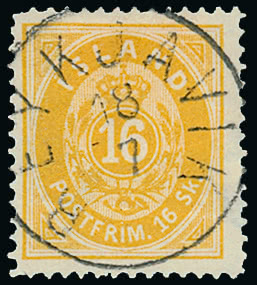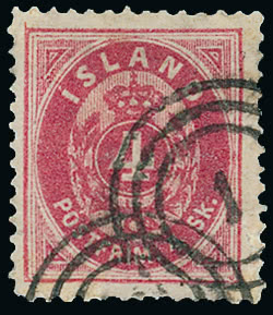 1097 | Sale number: 109 Iceland: Maritime Mail: 1876-95 perf. 14 x 131/2 16a. brown (Facit 13) with clear Copenhagen ''1'' cancellation (Facit type D1), fine. Price Realised UNSOLD |