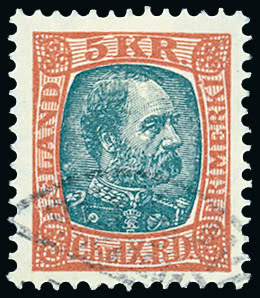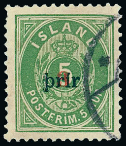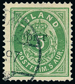 1053 | Sale number: 109 Iceland: 1897 ''prir'' type 6 on 5ore. green, fine used. Facit 37. Photo. Price Realised UNSOLD |
