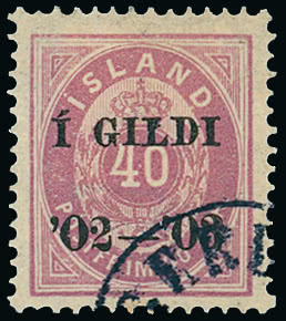 1056 | Sale number: 109 Iceland: 1902-03 ''GILDI'' overprints: Perf. 14 x 131/2 40a., perf. 121/2 4a., 10a., 40a., 50a. (2, one with inverted frame), all with inverted watermarks, some unlisted. (6) Price Realised UNSOLD |