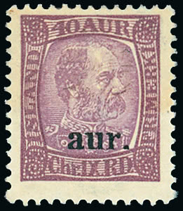 1067 | Sale number: 109 Iceland: 1921-30 Surcharge issue: 20a. on 40a. deep mauve, a mint example with variety ''20'' omitted, extremely rare as this is one of only two known. R.P.S. certificate (2012). Facit 100, var. Photo. Price Realised UNSOLD |