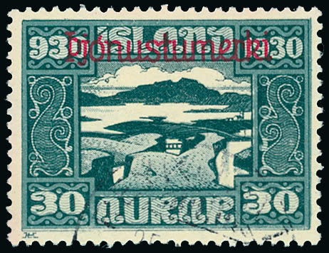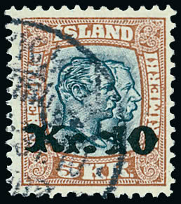 1068 | Sale number: 109 Iceland: 1921-30 Surcharge issue: 2k. on 25a. to 10k. on 5k., mint, mainly fine. The property of another vendor. S.G. 147-150a. Photo. Price Realised £150 |