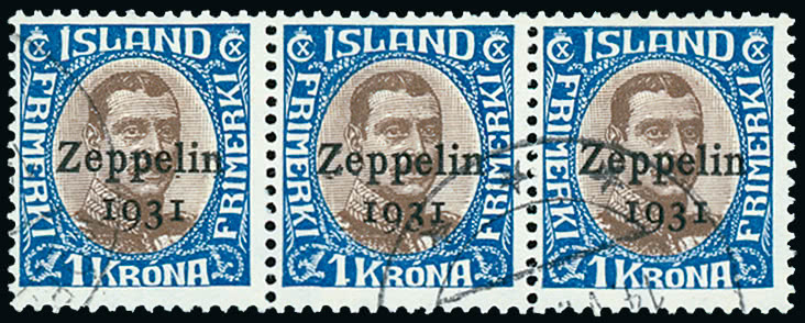 1074 | Sale number: 109 Iceland: 1931 Zeppelin set and 1k. strip of three, centre stamp showing bulge to the right of ''1'', fine used. Facit 162-164, 163vi. (4 items) Photo. Price Realised UNSOLD |