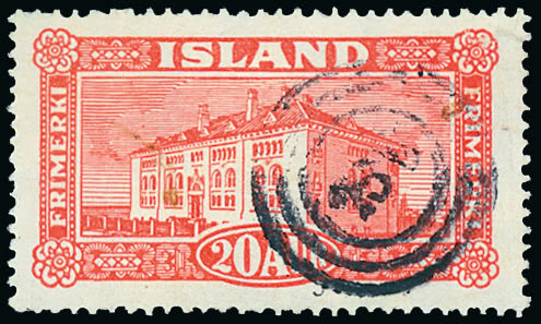 1070 | Sale number: 109 Iceland: 1929 ''236'' type D1 small ring cancellation (Reykjavik) used in error at Vatnsleysa on 1925 20a. and 1931-33 Gullfoss 20a., with type 2 large ring cancellation matched pair, fine and rare. Photo. Price Realised UNSOLD |