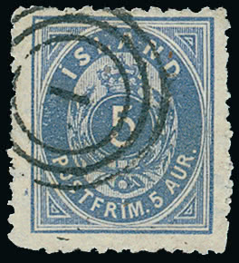 1096 | Sale number: 109 Iceland: Maritime Mail: 1876-95 perf. 121/2 5a. blue (Facit 23) with clear Copenhagen ''1'' cancellation (Facit type D1), fine. Photo. Price Realised UNSOLD |