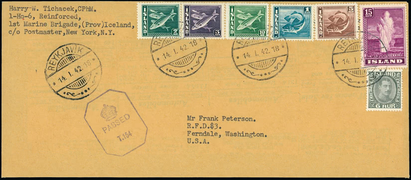 1099 | Sale number: 109 Iceland: U.S.A. Military Post: W.W.II: 1941 covers (2) with ''FIRST MARINE BRIGADE/PROVISIONAL'' cancellations, also rare 1942 cover endorsed ''1 Headquarters Reinforced 1st Marine Brigade (Provisional)'', franked with Icelandic stamps cancelled by Reykjavik c.d.s's. (4 items). Photo. Price Realised UNSOLD |