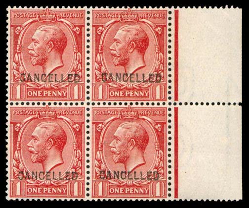 1134 | Sale number: 19 King George V: 1912–24 watermark Royal cypher 1/2d. overprinted ''CANCELLED'' type 14, a block of four, very fine and fresh with gum. S.G. Spec. N14v, cat. £160. Price Realised £40 |