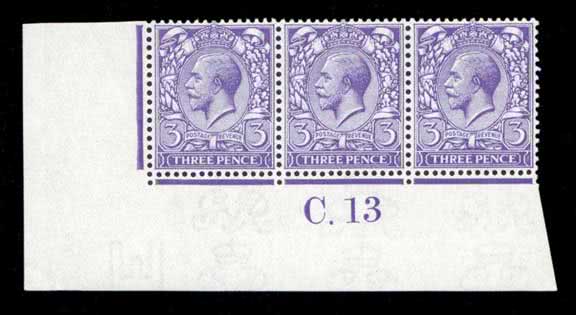 2223 | Sale number: 15 King George V: 1912–24 watermark Royal cypher 3d. brownish-violet plate 6b control ''R21'' control strip of three, perf. type 2A, very fine unmounted mint. S.G. Spec. N22(12). Price Realised UNSOLD |